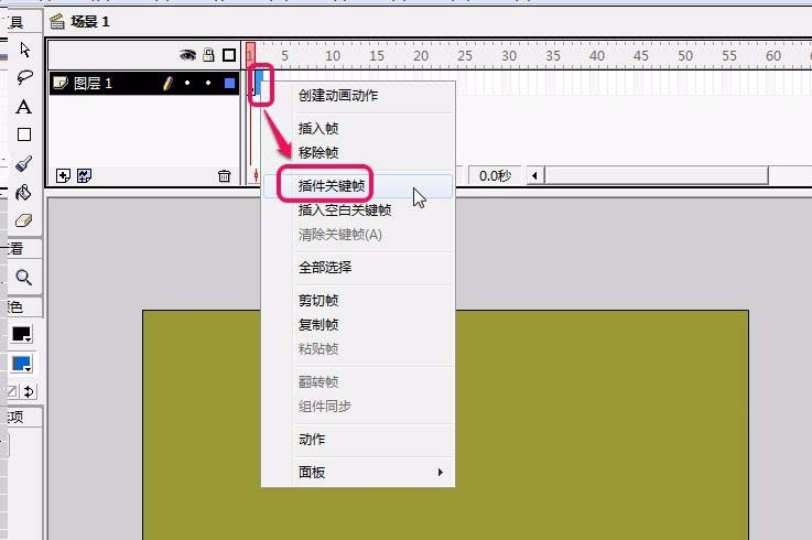 3、在第2幀單擊鼠標(biāo)右鍵,選擇菜單中的“插入關(guān)鍵幀”命令。