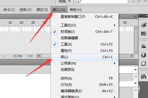 4、也可以點擊窗口菜單,在彈出的菜單命令中點擊庫命令。