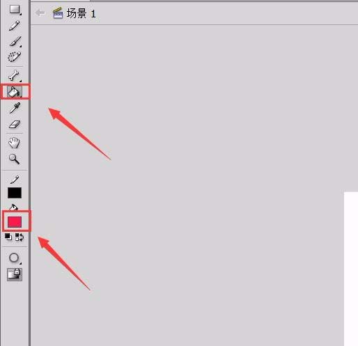 6、再在flash的工具箱內找到顏料桶工具,并設置填充的顏色,如圖所示: