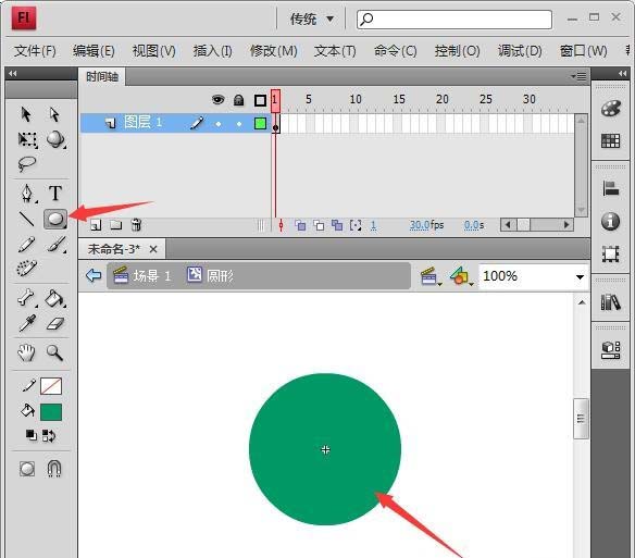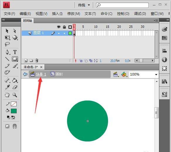 4、選擇圓形工具,在工作區中按住Shift拉出一個正圓。點擊場景1,回到場景。