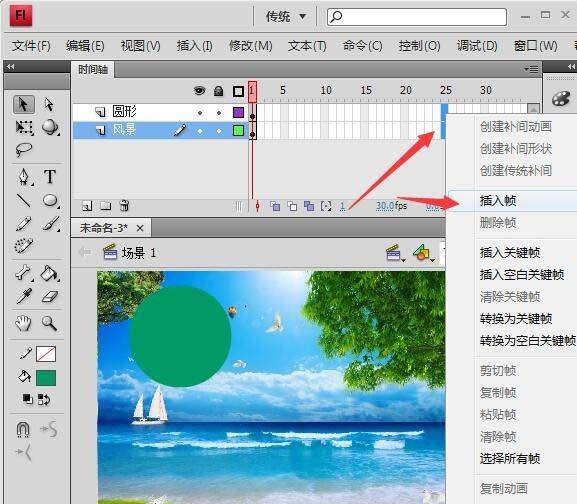 Flash中中想要制作一個傳統的補間動畫,該怎么制作一個運動的圓形,而透過圓形可以看到底下的風景圖,該怎么制作呢?下面我們就來看看詳細的教程。