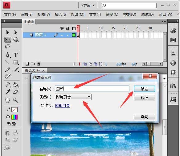 3、接來按Ctrl+F8彈出創建新元件,輸入名稱圓形,類型選擇影片剪輯。確定。