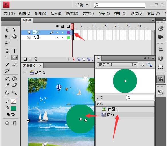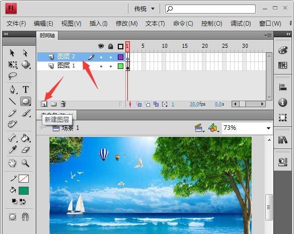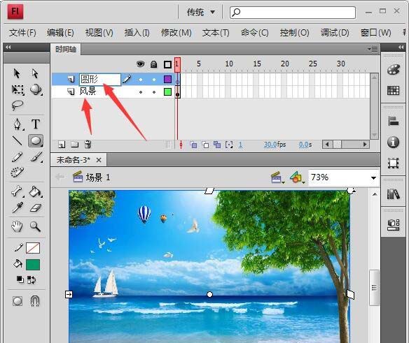 5、在時間軸上點擊新建圖層,建立圖層2,再雙擊名稱改名為圓形,圖層1改名為風景。