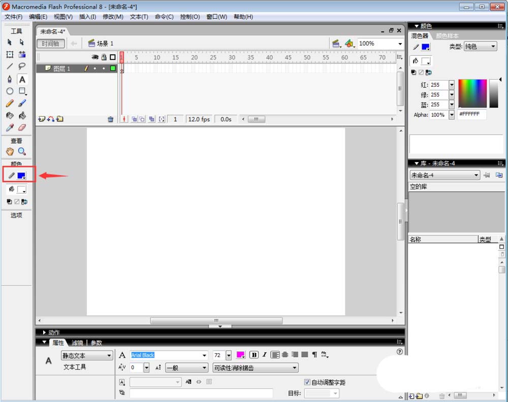 6、按住鼠標(biāo)左鍵不放,在舞臺上拖動,繪制一個有填充色的長方形;