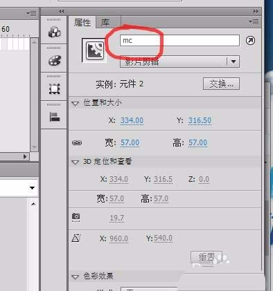 3、把影片剪輯拖到舞臺上,設置實例名mc