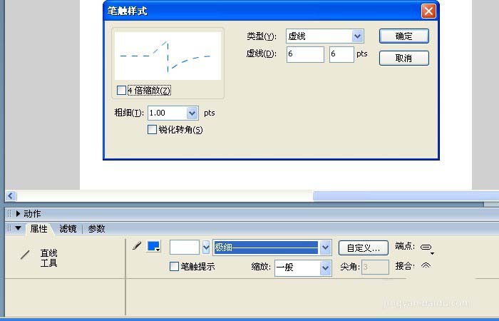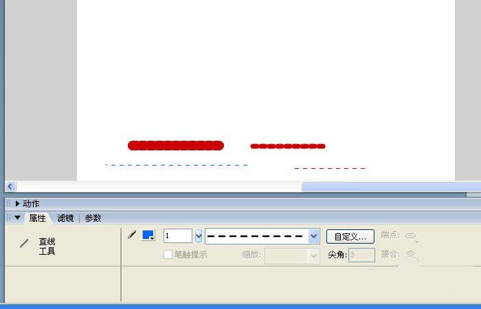 6、在Flash軟件左邊,鼠標(biāo)左鍵單擊工具欄上的【線條工具】,在線條工具的屬性面板上,單擊【自定義】按鈕,在彈出的窗口上可以修改【筆觸樣式】,可任意選擇好后,在畫(huà)布區(qū)繪制幾根線來(lái)看效果。