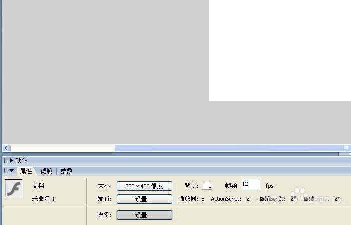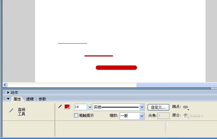 3、在Flash軟件的底部是動(dòng)作面板和屬性面板,這兩個(gè)面板也是經(jīng)常用的,這里以直線工具來(lái)介紹屬性面板的參數(shù)。