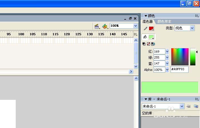 2、在Flash軟件的右邊是顏色面板和庫(kù)的面板,這兩個(gè)面板是經(jīng)常用的,做好的圖形文件可以用庫(kù)的形式予以保存。