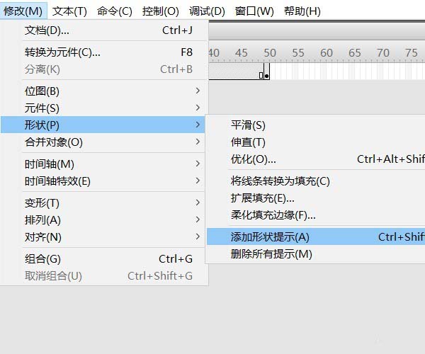 4、Ctrl+shift+H,為第一幀的形狀添加形狀提示(修改——形狀——添加形狀提示)。