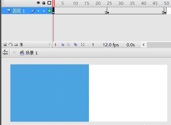 7、第50幀矩形移至舞臺右側(cè),回到第30幀創(chuàng)建補間動畫。