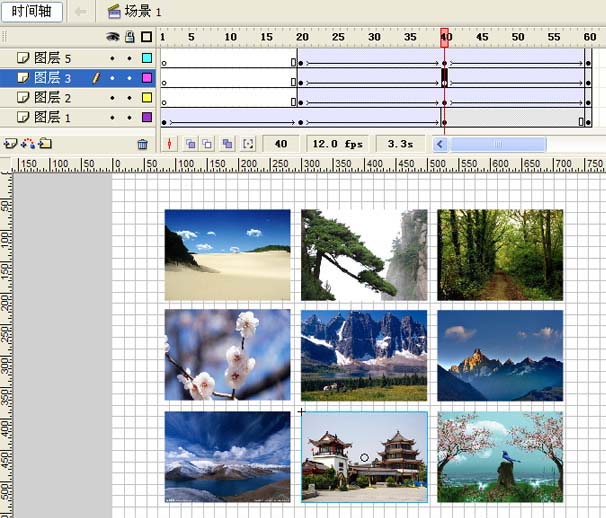 9、再次根據(jù)各個(gè)圖片的位置進(jìn)行調(diào)整,使其布局更加美觀,調(diào)整完成后,按ctrl+enter組合鍵進(jìn)行測試動(dòng)畫效果。