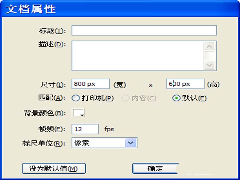 1、首先啟動(dòng)flash8,新建一個(gè)大小為800*600,背景顏色為白色,幀頻為12fps的文件。