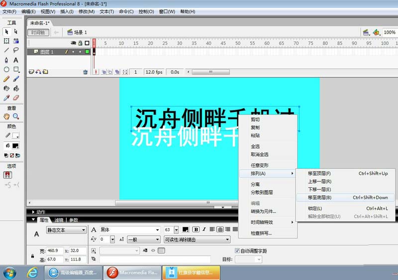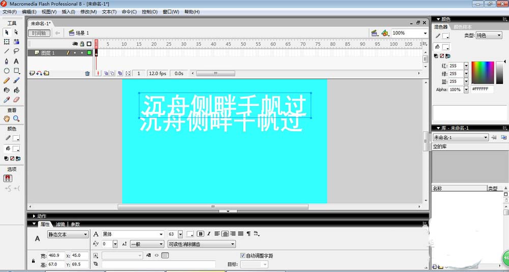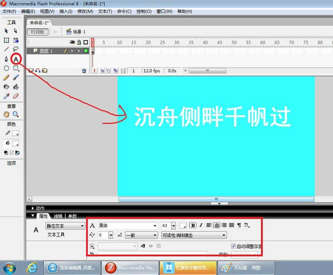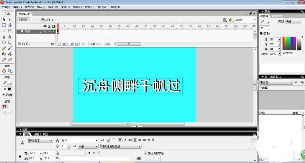 3、利用左側工具箱中的文本工具,在舞臺中輸入文本“沉舟側畔千帆過”,如圖,在屬性上把字體設置成黑體,字的顏色為白色。