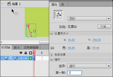 4、回到“場景1”,在“時間軸”面板上將當前圖層重命名為“花”,將“庫”面板中“花擺動”圖形元件拖入舞臺并適當調整其大小和位置,選中該實例,在“屬性”面板“循環”選項“第一幀”處填寫1~10的任意數字,如圖4所示。
