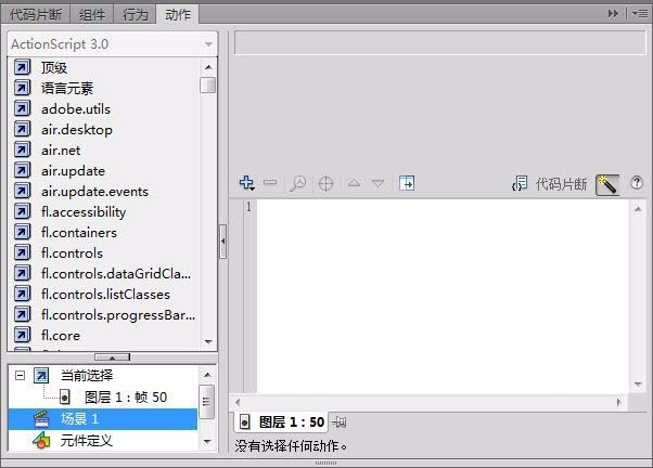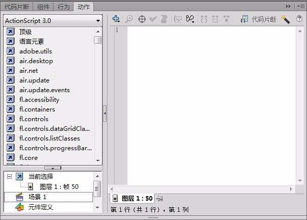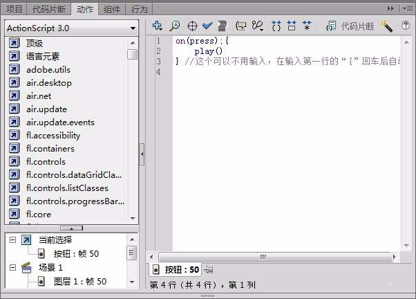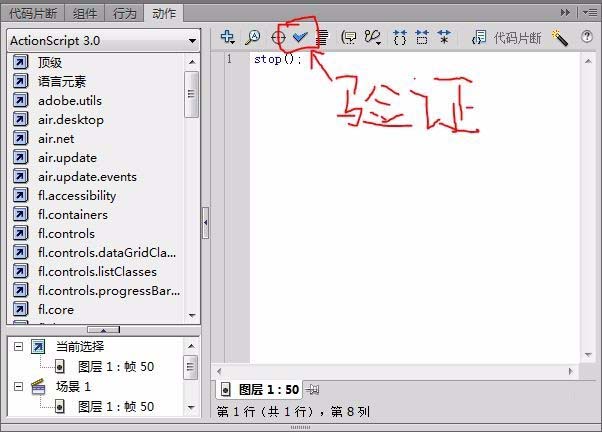 6、在第一行輸入“stop();”而且下方的“場(chǎng)景1”中也會(huì)添加一個(gè)“圖層1:幀 50”