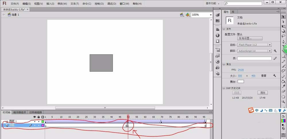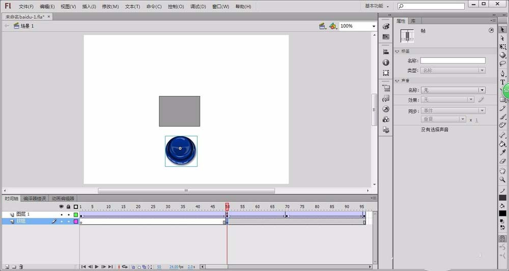 4、點(diǎn)擊“按鈕”圖層,在第50幀插入關(guān)鍵幀,然后按鈕可以隨便選擇,在這里我使用的是【classic buttons】中【Arcnde buttons】中【arcnde buttons - blue】,最后拖動(dòng)到舞臺(tái)(窗口)即可