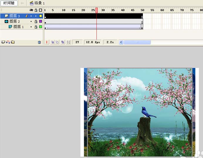 6、新建圖層3,從庫中拖拽一張圖片到舞臺上,設置大小為800*600,并設置全居中(水平居中、垂直居中)