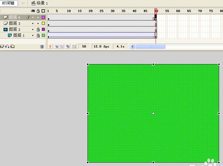 8、選擇圖層4第一幀,設置矩形大小為5*5,右鍵單擊1-50幀之間任意一幀,選擇創建補件動畫,設置圖層4為遮罩層。
