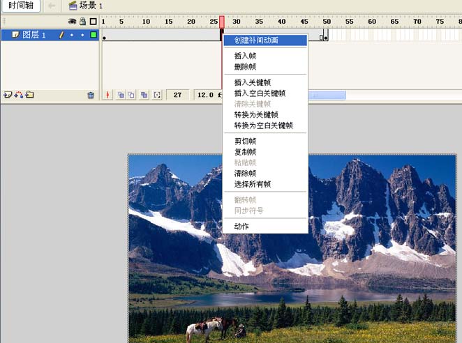 3、在圖層1的第50幀處按f6鍵插入關鍵幀,選擇舞臺上的圖片,設置左對齊,接著右鍵單擊1-50幀中任意一幀,從下拉菜單中選擇創建傳統補間動畫。