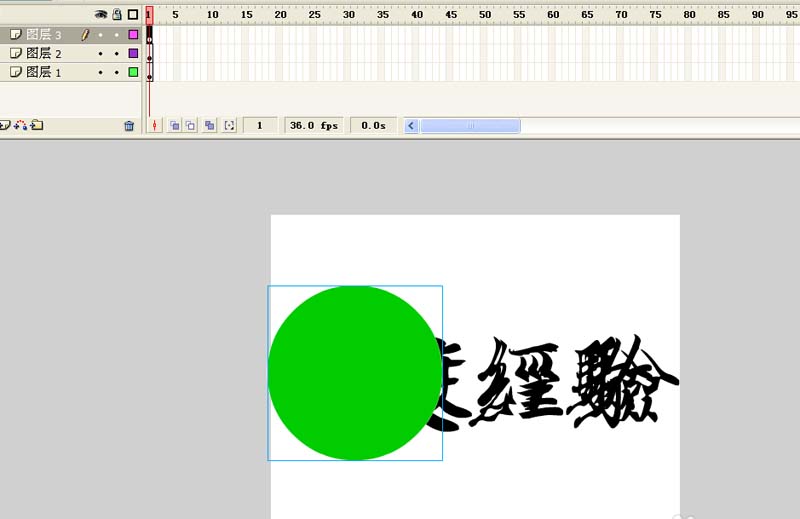 7、選擇圖層3的第50幀將圓形拖拽到右邊,右鍵單擊圖層3從下拉菜單中選擇遮罩層選項,這樣就把圖層3設置為遮罩層,圖層2為被遮罩層。