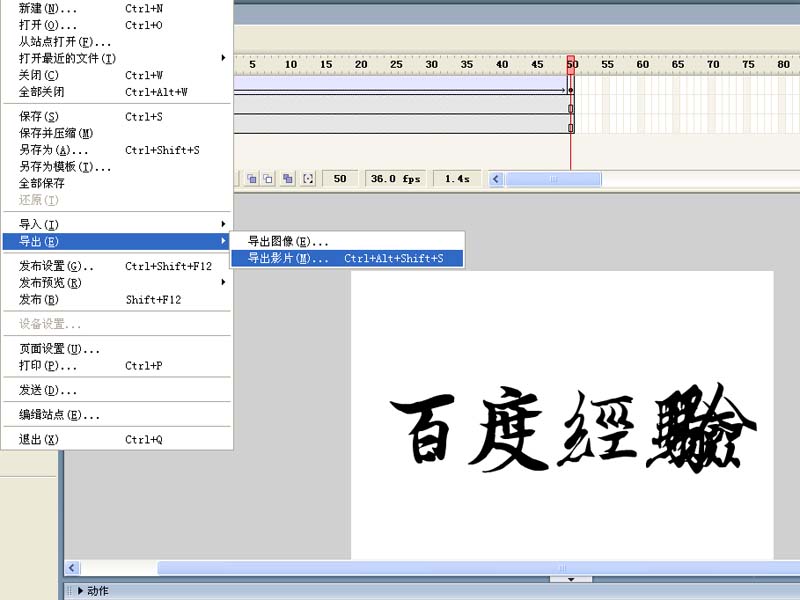 2、選擇工具箱里的文字工具,在舞臺上輸入文字“百度經驗”,設置字體為王羲之書法字體,字號為180,字體顏色為黑色。