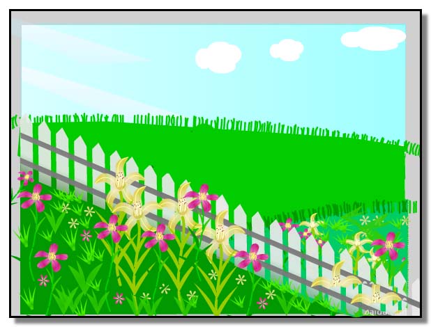 4、在天空這里,用橢圓工具畫幾朵白云。再用線條工具畫出兩束光線。從左上角向右下照射。背景圖層在這里基本完成。在這里看到花朵,小草等露出了舞臺,這個沒關系的,保存后,觀看動畫時,只顯示舞臺這個范圍的。下面接著制作蝴蝶、蜻蜓、風車的動畫。