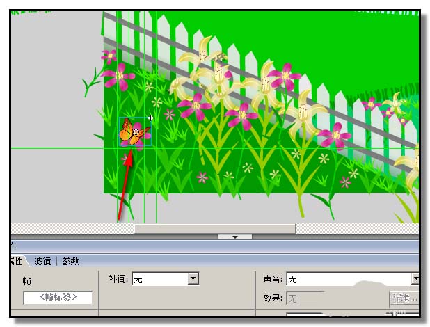 6、然后,把蝴蝶1元件拖放到場景舞臺左下角,然后,在蝴蝶1圖片第15幀位置,插入關鍵幀,接著,把蝴蝶移到花朵上。再在第1至第15幀任意幀上點下,在屬性面板這里,設置動畫補間。完成蝴蝶進入花園飛到一朵花上的動作;蝴蝶會在一朵花上停留一些時間,所以再這樣操作:復制第15幀,然后,粘貼到第16至第20幀。