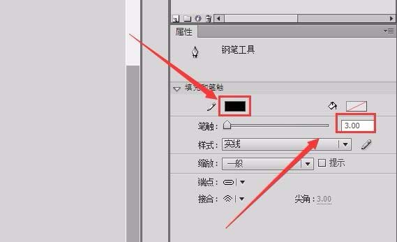 7、在選擇鋼筆工具,在屬性里設置筆觸顏色為黑色,筆觸大小為3,如圖所示: