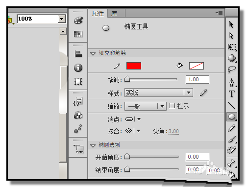 1、啟動FLASH軟件,新建文檔。文檔大小自定。在右側工具欄中選取橢圓工具;并設置其屬性為如下圖所示。
