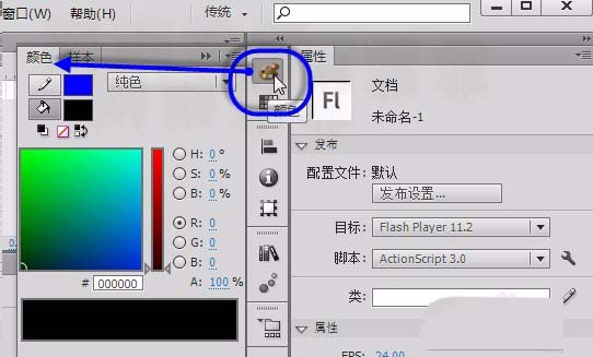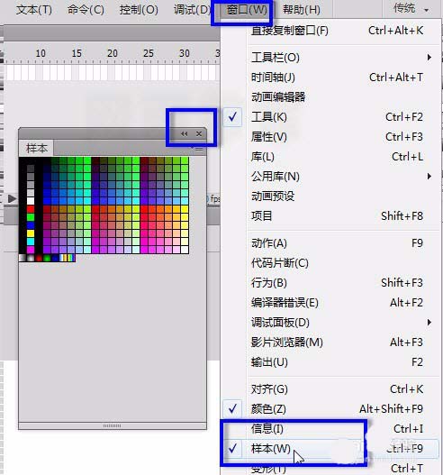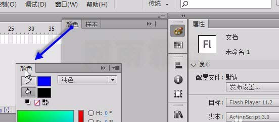 <2>看上面(步驟2)內的截圖,當我將顏色面板點擊打開之后,在顏色面板的右邊是“樣本”面板。它們兩個并排在一起,說明它倆是“成組”存放的面板,flashCS6默認的是將顏色和樣本兩個面板組合在了一起。