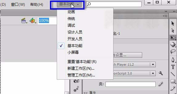 在flashCS6整個界面的右上角,有一個按鈕,單擊后,會出現快捷菜單,如下圖。