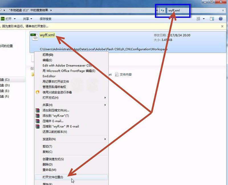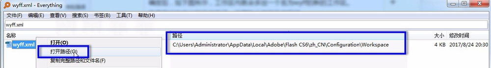 我這里使用的是一款名為everything的搜索軟件,超快速的就可以搜索到,如下圖,通過右鍵單擊它,打開路徑,就可以瞬間打開一個文件夾,這個文件夾內存放的就是我們自定義的工作區了。僅需將整個文件夾都復制到D盤,當重做系統后,安裝完畢flashCS6之后,將D盤內的這個文件夾再復制回去,就可以“滿血復活”了,是不是美滋滋