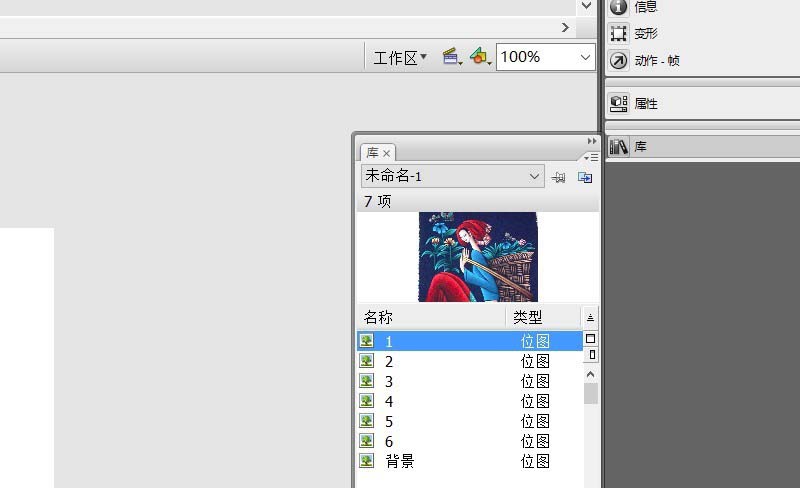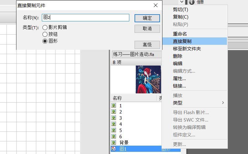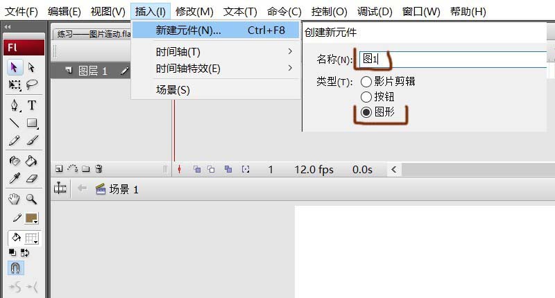 2、將圖片變為元件。插入——新建元件——圖片,取名圖1。