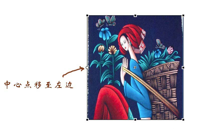 10、在第一幀拖入元件圖1,Q鍵調出變形工具,將元件中心點移至左邊。