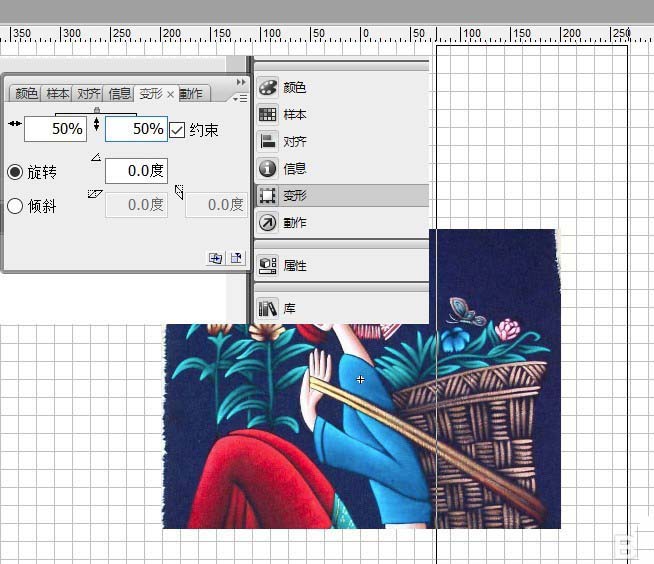 5、圖片修改后與原比例不同,如想同比例縮放,可在變形面板中勾選“約束”,更改數值后回車。在視圖菜單里調出標尺與網格,拖動選擇框,DELETE刪去多出的部分。