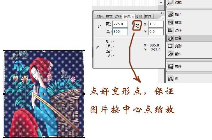 3、將圖片1拖入舞臺,使中心點對準舞臺中心。
