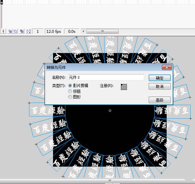 5、創建補間動畫,并設置順時針旋轉1次,新建圖層2,拖拽元件2到舞臺,并設置全居中,100幀處插入關鍵幀,創建補間動畫,并設置逆時針旋轉1次。