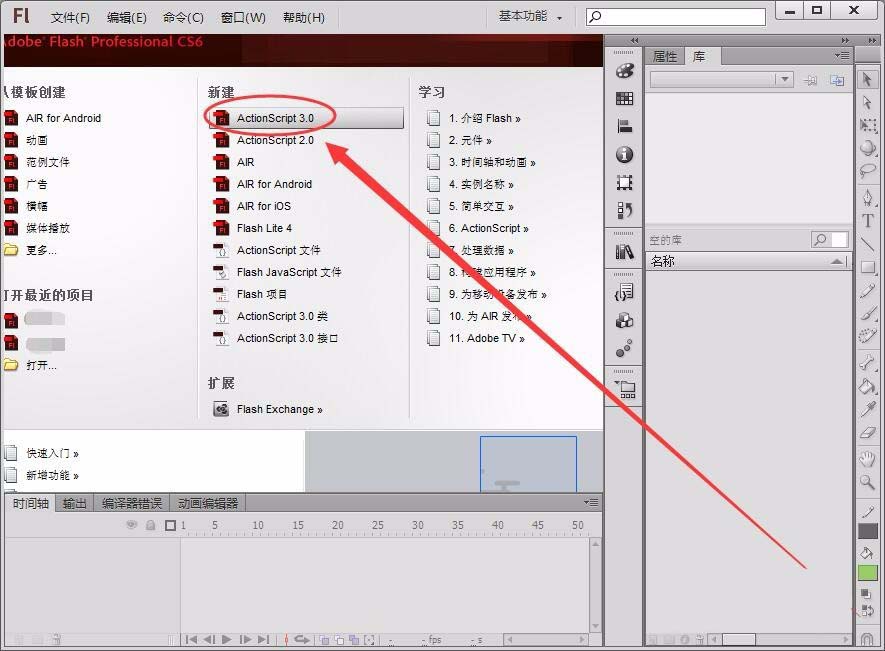 2、在出現(xiàn)的窗口中,選擇“ActionScript3.0”選項(xiàng),新建一個(gè)空白文檔。
