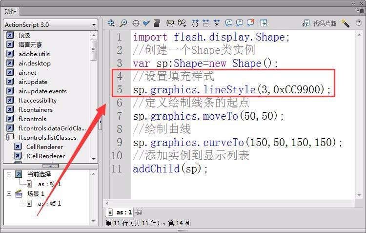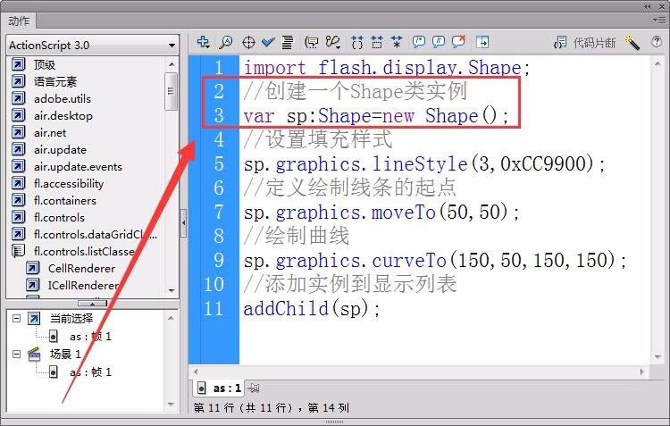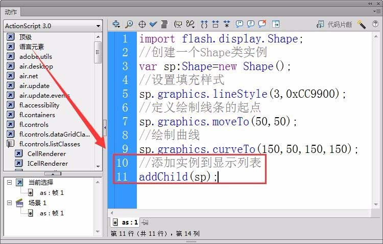 8、最后,將實(shí)例添加到顯示列表中,使弧線能顯示在舞臺(tái)上。