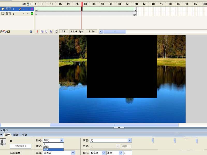 5、選擇圖層2中1-60幀中的任意一幀,修改屬性面板中的動畫為形狀。