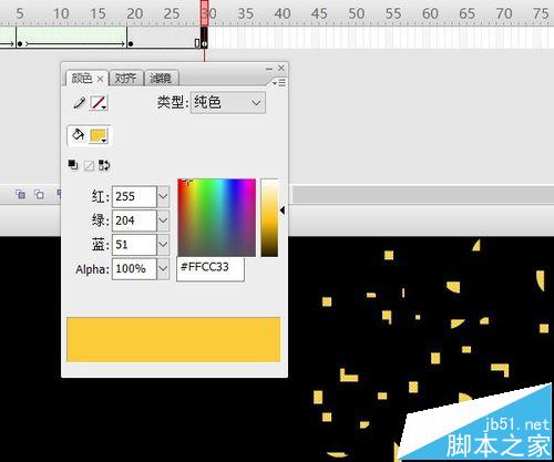 7、第30幀插入關(guān)鍵幀,所有碎片選中狀態(tài),顏色顏色面板中選擇顏色,將碎片更改為明亮的黃色系,我選了#FFCC33。