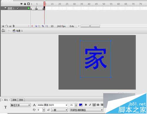 4.按照上面的流程,在第10幀上插入關(guān)鍵幀,快捷鍵f6,把家字改為另一種顏色。如下圖所示: