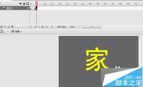 2.在圖層1的第5幀上插入關(guān)鍵幀,在選中第5幀的基礎(chǔ)上,選中家字。如下圖所示: