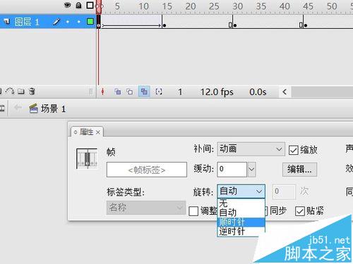 10、回到第一幀,右鍵——創(chuàng)建補間動畫,屬性面板中將旋轉(zhuǎn)改為“順時針”。