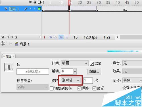 11、第15幀創(chuàng)建補間動畫,旋轉(zhuǎn)選項欄里設為“逆時針”。