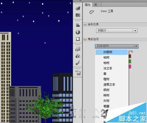 ①工具欄中調(diào)出Deco工具,屬性面板繪制效果中選擇“建筑物刷子”,高級選項里選擇“摩天大樓4”。