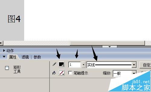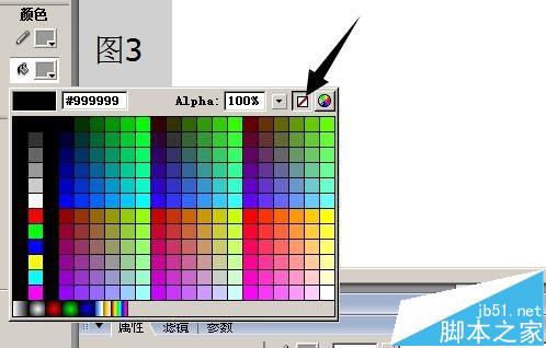 2、彈出顏色選項框,在框右上方,點如圖3箭頭所指的圖標,表示無填充色;再在屬性面板中,把“筆觸顏色”設置為黑色;把“筆觸高度”設置為1;把“筆觸樣式”設置為“實線”;如圖4所示;