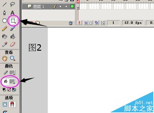 1、以圖中新建flash8文件為例演示操作步驟 ;在界面的左側工具箱中點“矩形”工具圖標;再點“填充色”圖標;