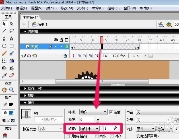 8、這里選擇動作補間動畫,然后設置好旋轉的方向和次數,這樣就完成了。