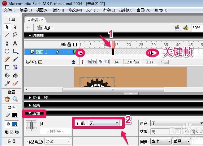7、鼠標點擊兩個關鍵幀的中間,然后打開屬性面板,點擊這里的補間!